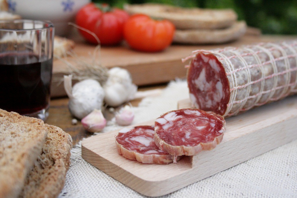 Sempre selezionata e lavorata a mano, la carne viene tritata a medio taglio e condita con sale, pepe nero e vino aromatizzato all’aglio. Il composto viene poi insaccato in budella naturali sterilizzate, bucate, legate a mano con spago e infilato in rete elastica.